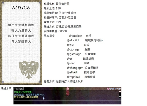 前言:世界受到魔物大舉入侵,所有勇者躲進避難所,將其命名為"冒險者洞窟",所有倖存下來的人稱之為"冒險者",歡迎來到"冒險者世界"。伺服器開設日期: 2015-03-20